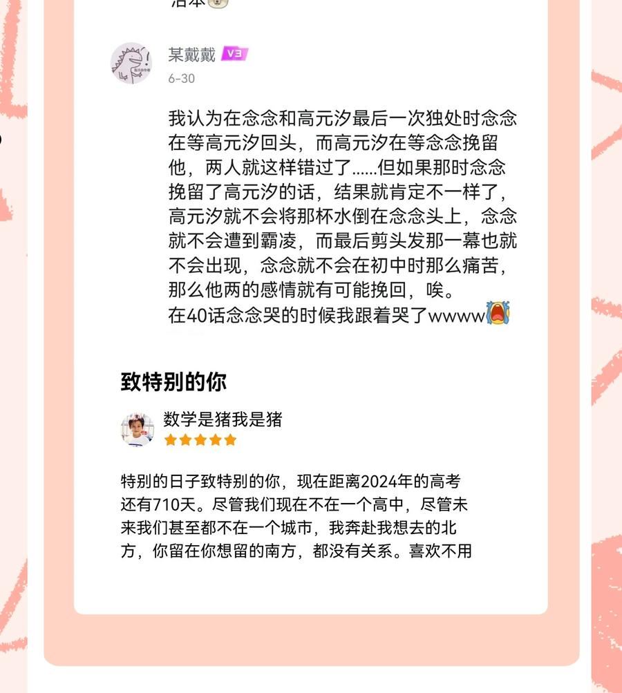 简介吴念念步入高中生活的第一天就发现自己和留级的竹马成了同班同学,甚至发生被撞破自己画腐漫的大型社死现场。但,渴望重新开始的念念却发现高中的生活并不像她所想象的那般一帆风顺:身边同学的嘲讽针对、压力重重的学业等等。当站在人生的十字路口,念念又该如何选择?