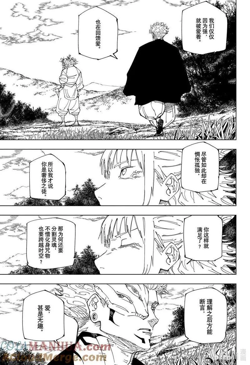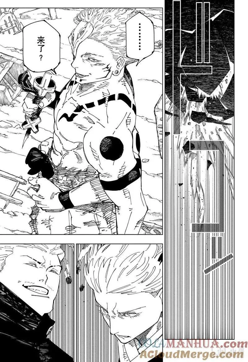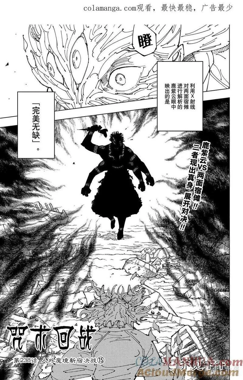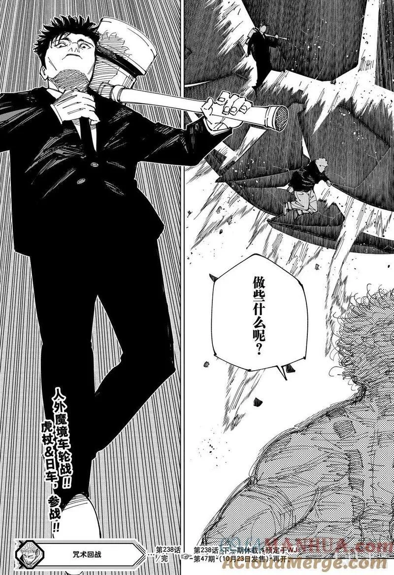 【公告】由于日本杂志休刊,本作1月13日同步休刊一期,恢复营业后会立即奉上哒!请大家耐心等待哦~拥有超人般身体能力的男子高中生虎杖悠仁的黑暗幻想故事。因为某种理由,想要每天17点之前回家的虎杖悠仁来到了不强制出席的灵异现象研究会,享受着悠闲的活动。这样的某一天,来学校寻找被封印的诅咒之物的青年伏黑恵出现于虎杖的面前。